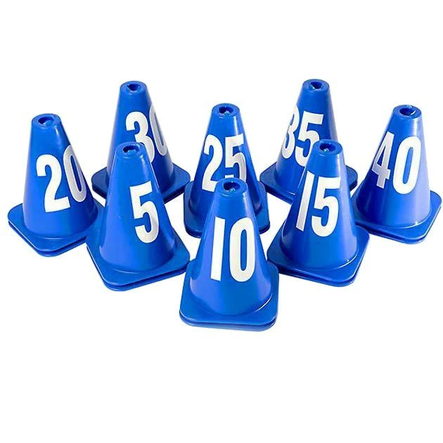 Set includes 16 cones with 100mm vinyl numbers. Set marks from 5 metres to 40 metres in 5 metre increments with a pair of each distance marker. Ideal for marking distance on discus, shot and javelin sectors.