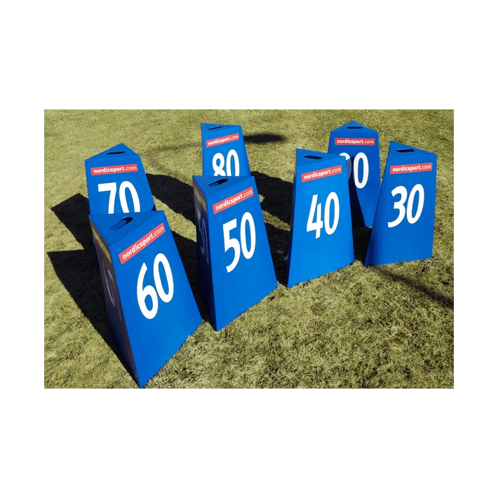 Set of 14, 3 sided fibreglass distance markers with digits showing 30, 40, 50, 60, 70, 80 and 90 metres.