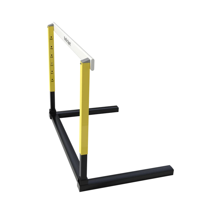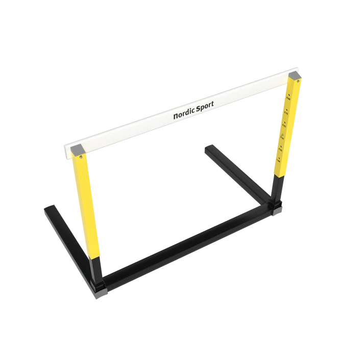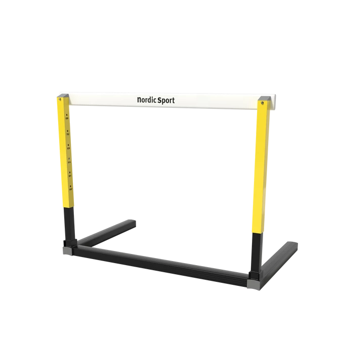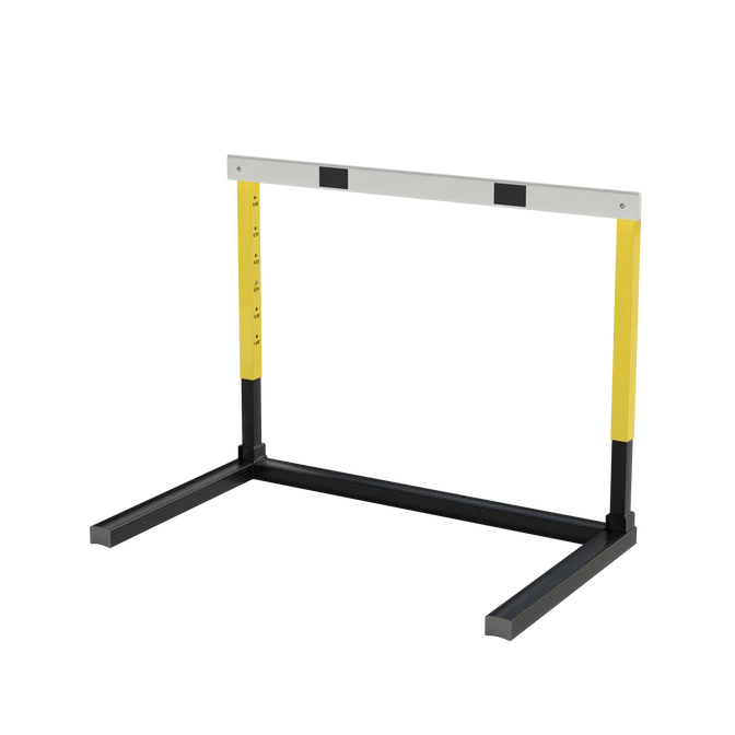 Fully automatic hurdle. Adjustment of the height and base weights is done simultaneously with one single handgrip. Frame of aluminium. Riser made of steel. All protruding parts have been eliminated to prevent injuries and facilitate stacking and transportation. Adjustable heights from 686 mm to 1067 mm. Hurdle crossbar made out of plastic. Weight: 14.3 kg. WA certified no E-99-0007.