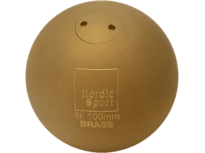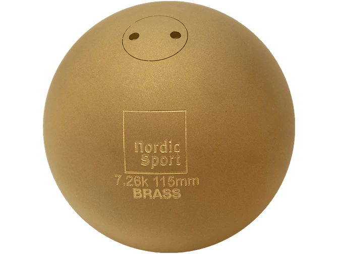 Competition shot for shot put, made of brass with matt finish. Sand blasted for best grip, within world athletics rules. Certified by World Athletics.