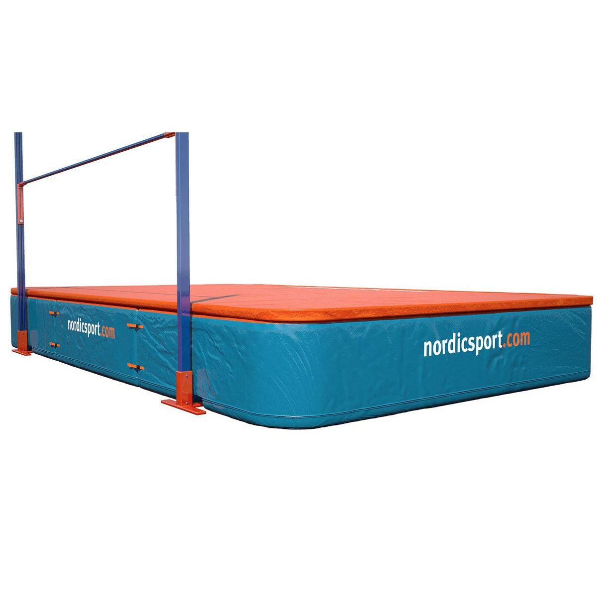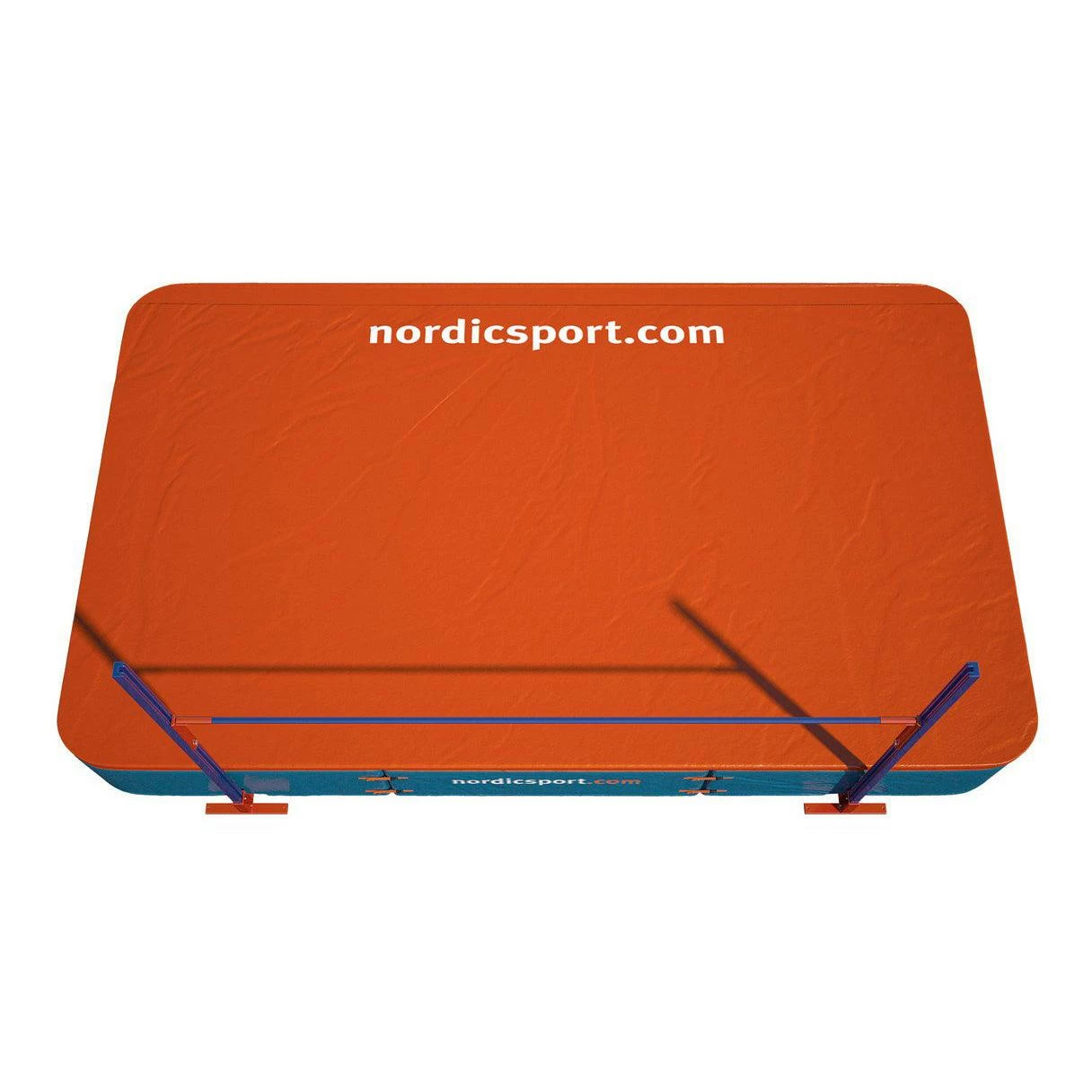 Competition pit consist of 3 base units with separate covers on all sections. Total size 6700 x 4000 x 800mm. The strong cover is made from armoured polyester net structure and the pit is filled with tunnel construction foam for safety and comfort. Reversible double-sided spike shoe protection wear pad. Weather cover is not included. World Athletics certified no E-99-0002.